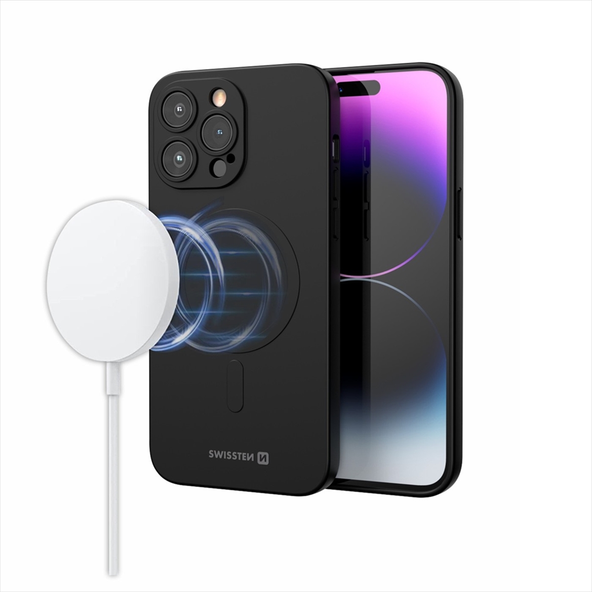 Elegant black silicone case SWISSTEN SoftJoy MagStick suitable for recharging MagSafe. Packed in a SWISSTEN blister.