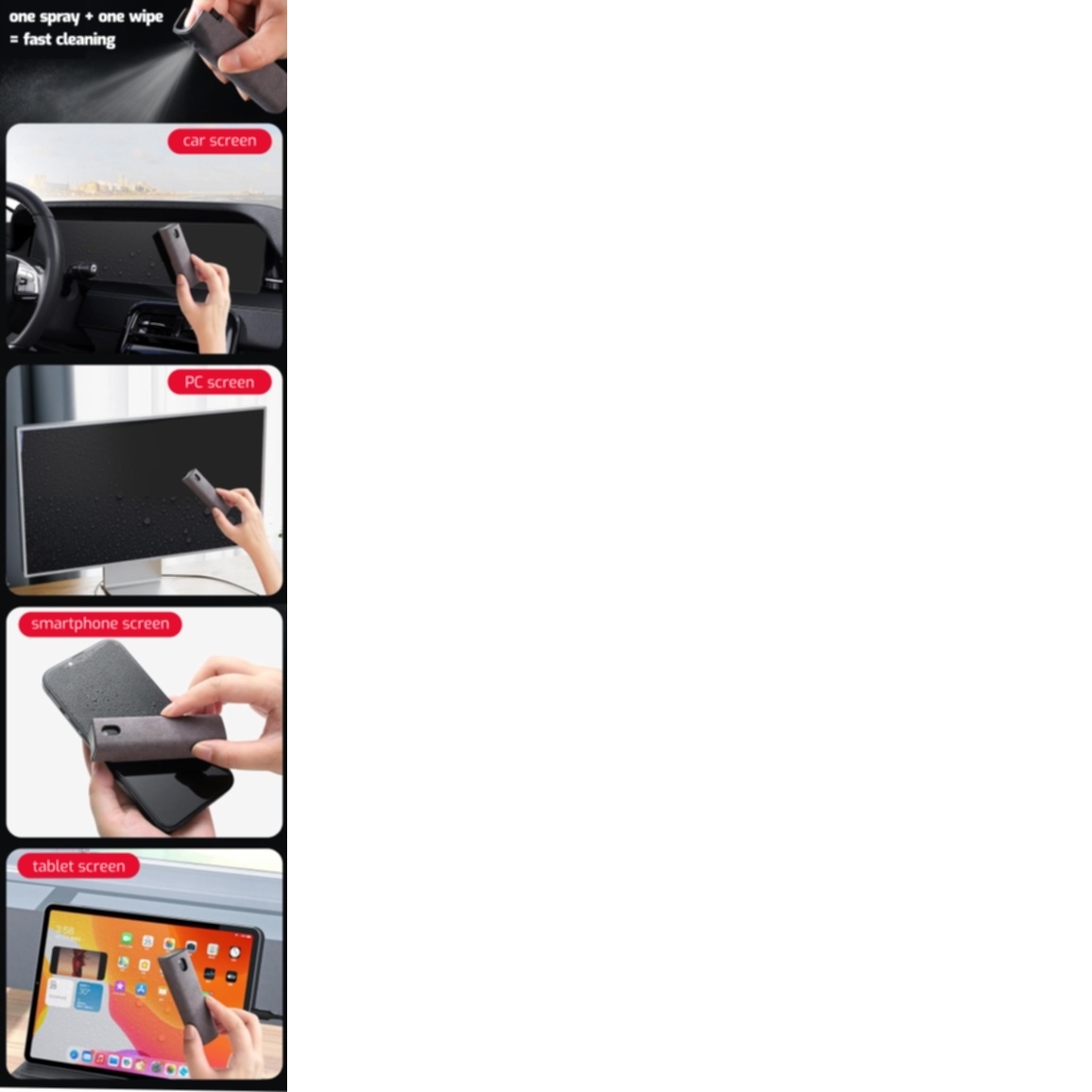 Spray the cleaning agent evenly on the display. Wipe off the product with the cloth included in the cleaner. Shake before use.